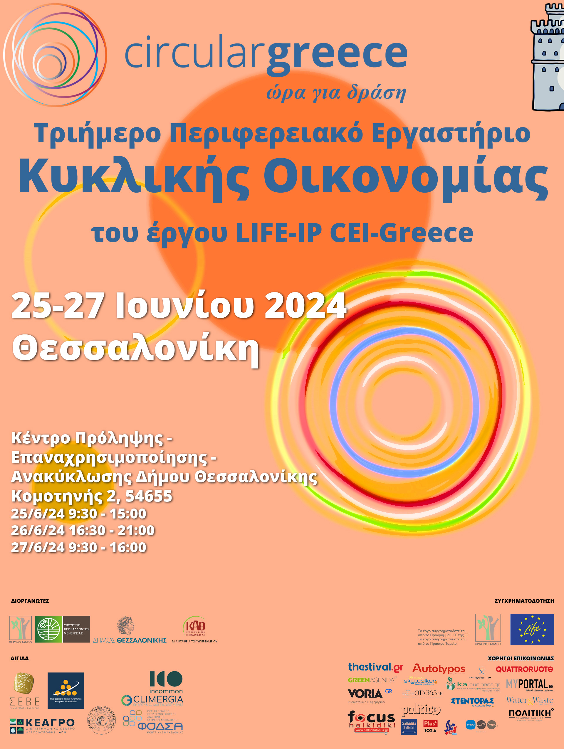 Το Πράσινο Ταμείο, το Υπουργείο Περιβάλλοντος και Ενέργειας (ΥΠΕΝ), ο Δήμος Θεσσαλονίκης και η Κεντρική Αγορά Θεσσαλονίκης Α.Ε. (ΚΑΘ) συνδιοργανώνουν και σας προσκαλούν στο «Περιφερειακό Εργαστήριο Κυκλικής Οικονομίας», από τις 25 έως και τις 27 Ιουνίου 2024, στη Θεσσαλονίκη (Κέντρο Πρόληψης – Επαναχρησιμοποίησης - Ανακύκλωσης Δήμου Θεσσαλονίκης, Κομοτηνής 2, ΤΚ 54655), στο πλαίσιο του Έργου LIFE-IP CEI-Greece – LIFE18 IPE/GR/000013 «Εφαρμογή της Κυκλικής Οικονομίας στην Ελλάδα».
